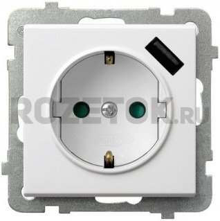 Розетка с заземлением «Shuko» со шторками 16А + зарядка USB 2,1А , скрытой установки, контакты самозажимные. 250V, IP-20, белый матовый, GP-1RSPUSB/m/75